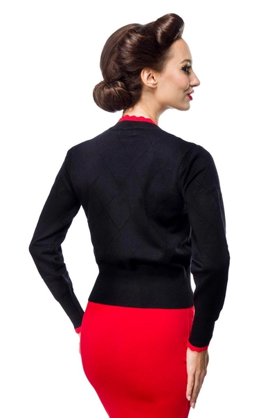 Cardigan de la marque Belsira, à manches longues, boutonnage sur la partie avant, avec des cerises tissées et bords colorés.