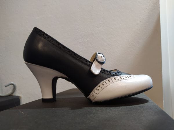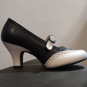 Chaussures à talons noires et blanches, avec lanière réglable, de la marque Grunge Boutik.
