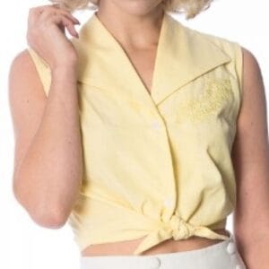 Chemisier jaune pastel avec des fleurs brodées au niveau de la poitrine. Se ferme avec des boutons et un nœud à l’avant. Sans manches.
