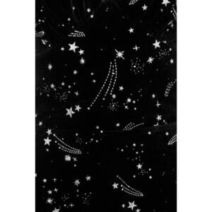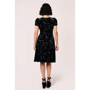 Mystérieuse et élégante, cette robe noire à imprimé étoiles séduit par son esprit rétro chic et son allure subtilement rock. Son décolleté en V met en valeur la poitrine tandis que la taille marquée sublime la silhouette avec féminité. L’imprimé céleste apporte une touche originale et intemporelle.
